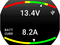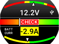 Voltmetr, dvojitý ampérmetr a diagnostický režim jsou aktivovány. Na obrázku je zobrazen proud baterie. (diagnostický režim vyžaduje 2 proudové senzory)