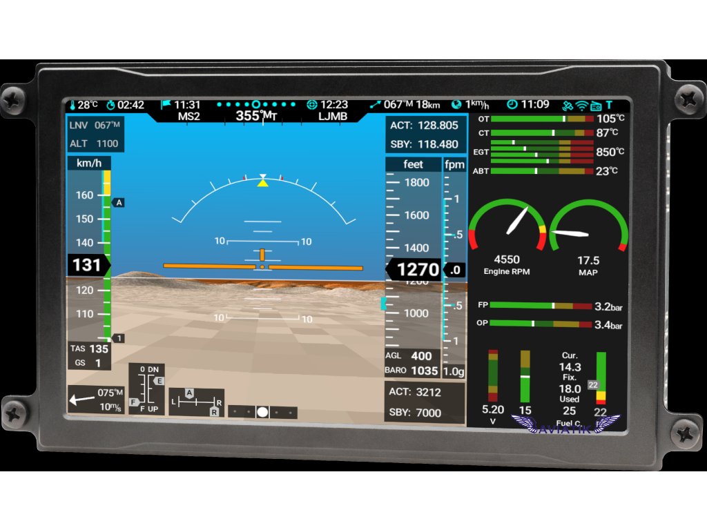 Dual display, doubles your options. Secondary Nesis is equivalent and can be used by a co-pilot or just as an extension, as a flight information system (EFIS), engine information system (EMS) or both.