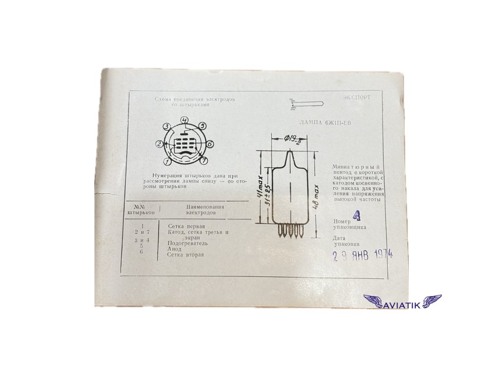 Zahraniční ekvivalenty pentody 6Ж1П-ЕВ: 6AK5(WA), EF95, EF95F, EF905, 6F32(V), DP61, PM05, M8100, 5654, 6096.