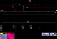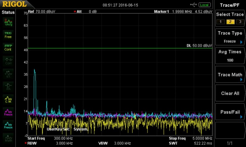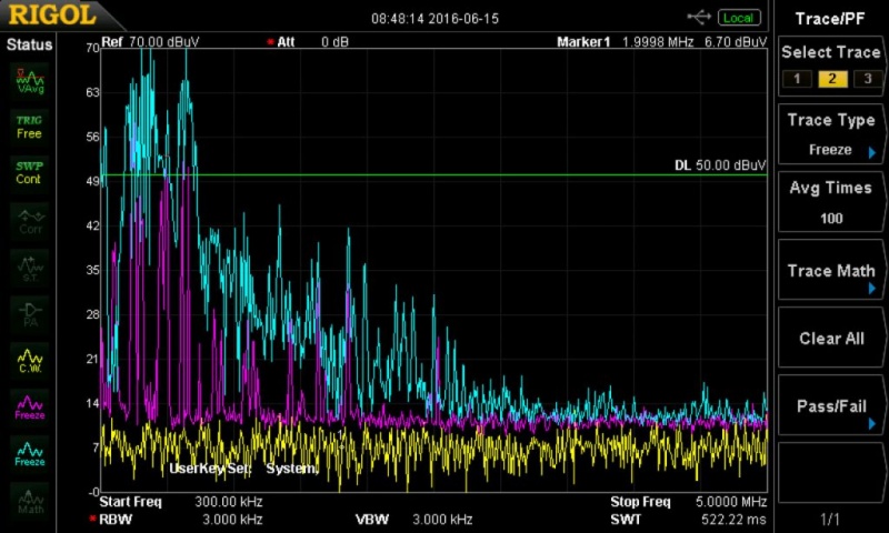 Žluté stopy zobrazují normální rádiový kmitočet pozadí. Modré stopy zobrazují EMI bez Spike-SD. Červené stopy zobrazují EMI se Spike-SD.