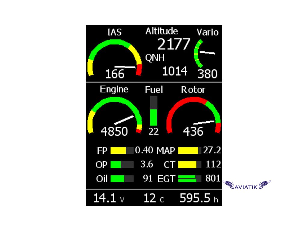 Pokud je na CAN sběrnici přítomna jednotka pro monitorování motoru (DAQU), Emsis PFD může také zobrazit příslušné informace o motoru a palivu.